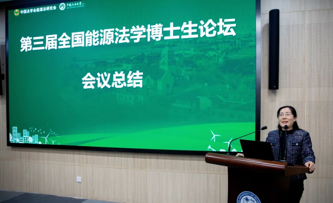闭幕式由中国法学会能源法研究会副秘书长陈兴华副教授主持,分论坛单元主持人分别汇报各单元情况。中国石油大学(华东)文法学院孙增芹教授做总结发言。孙增芹表示,专家和学子们贡献了精彩的观点,希望更多年轻学子加入能源法研究领域,成为未来的中坚力量,同时借用“三生万物”表示对未来蓬勃发展的期待。至此,第三届全国能源法学博士生论坛圆满闭幕。